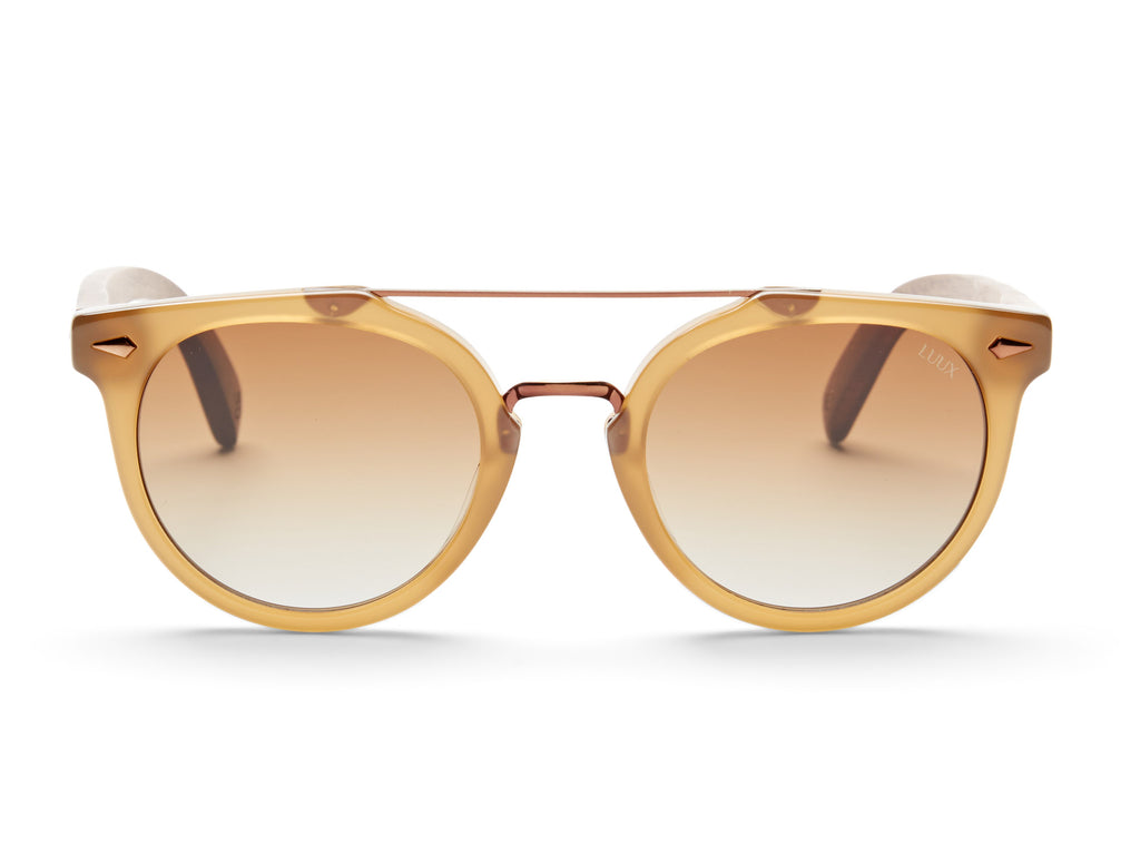 The newest addition to the Barque family, the Barque Ashore. The name inspired by our new sand coloured bio-acetate, along with the golden burls in the newly adopted Walnut Camphor wood. We've kept the double bronze brow bar to complement the brown tones and introduced our 3D bronze rivets on the front of the frame to complete the look. You have two options for lenses with either a full brown or gradient CR39 lens.